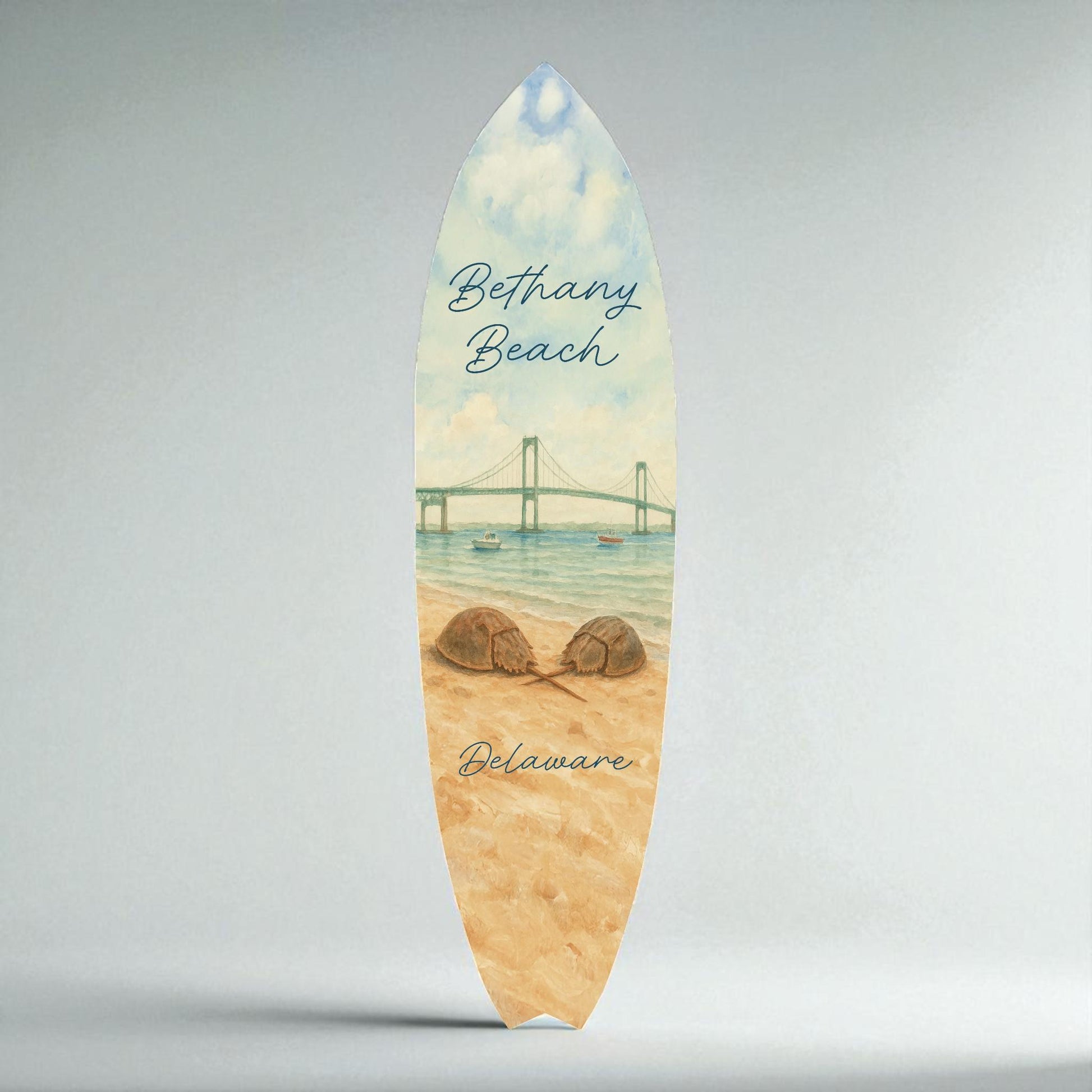 Bethany Beach PVC Surfboard Wall Art | 2–5 Ft Sizes | Outdoor Safe Coastal Decor | Indian River Bridge Background