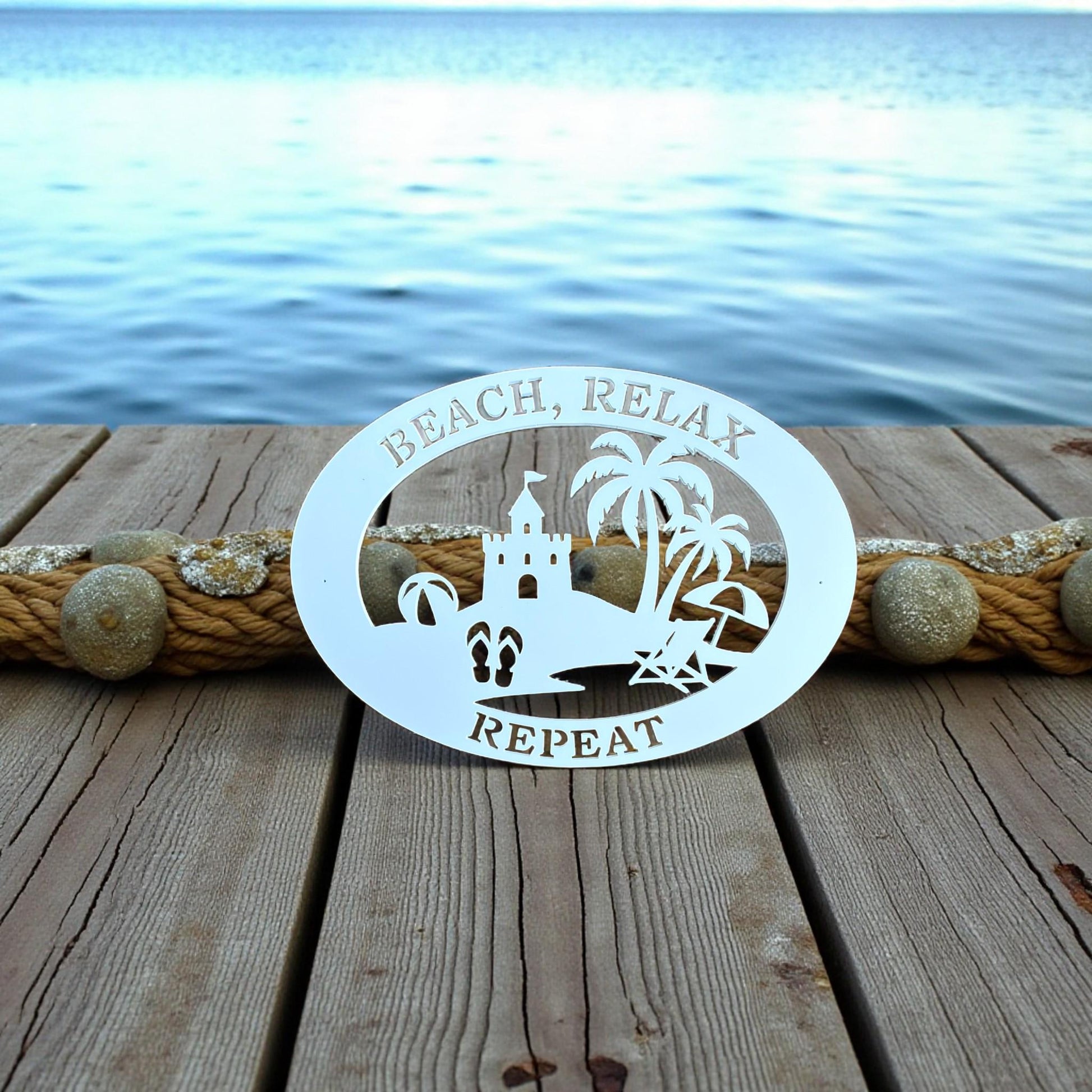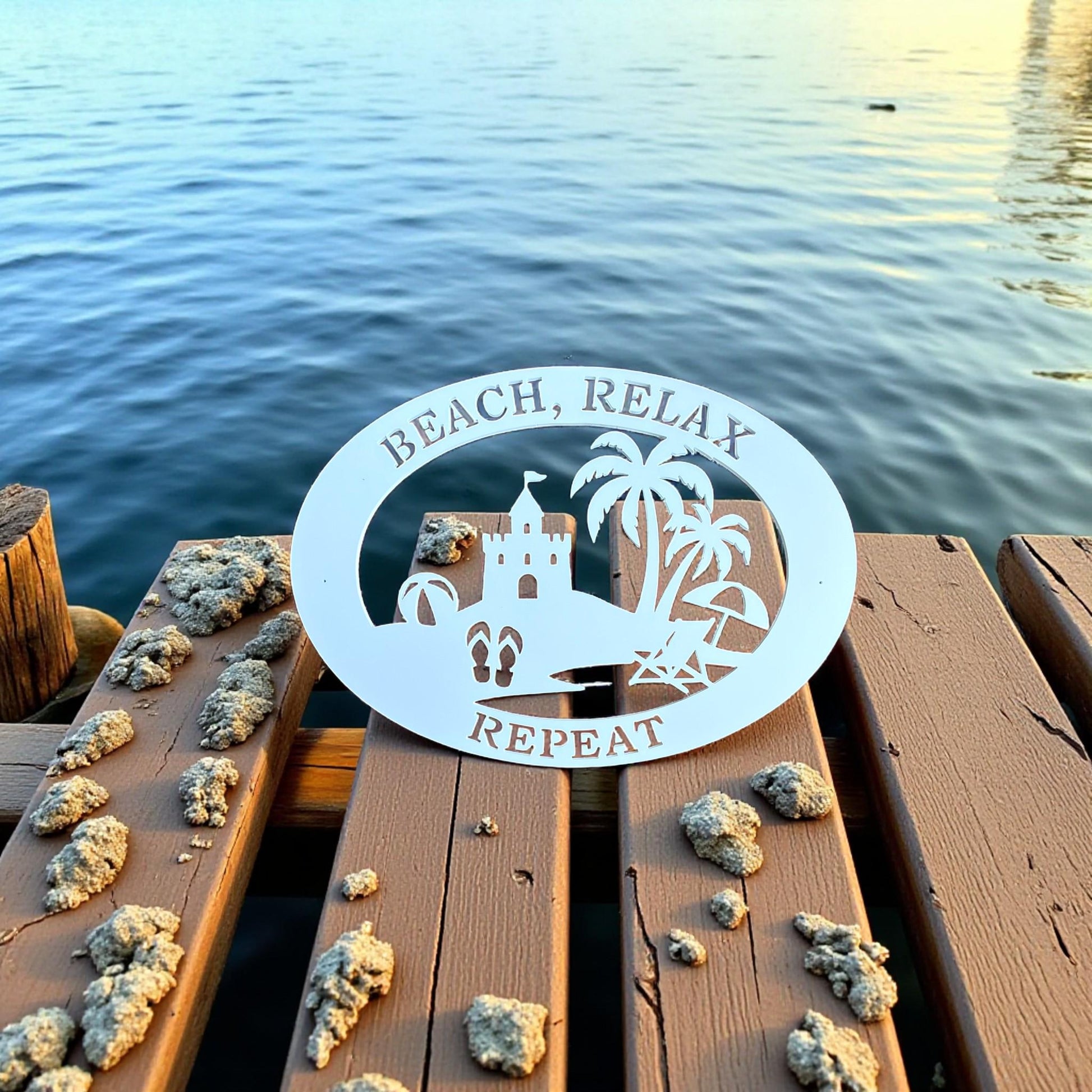 Bring vacation vibes home with this oversized Beach, Relax, Repeat PVC sign. Featuring palm trees, a sandcastle, flip-flops, and a beach umbrella, this oval sign is the perfect statement piece for coastal homes, patios, poolside retreats, or beach rentals.