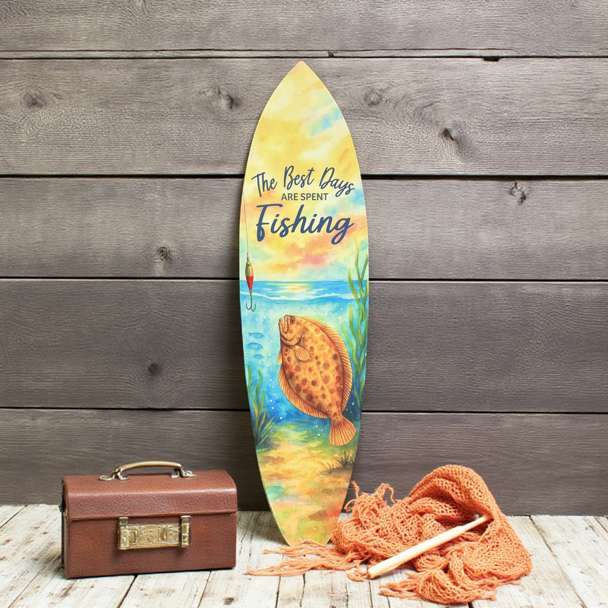 Fishing-Inspired Design: Showcases a flounder fish chasing a hook with the phrase "The Best Days Are Spent Fishing," available in 4 sizes from 2 feet to 5 feet for customizable coastal flair.