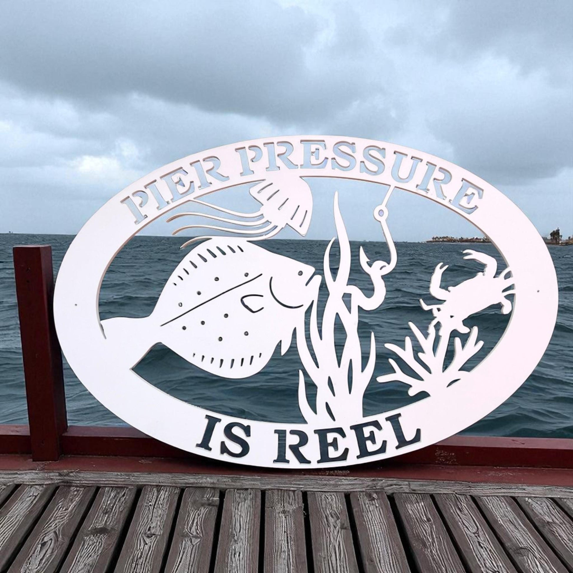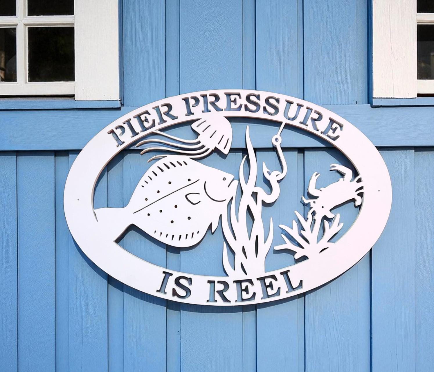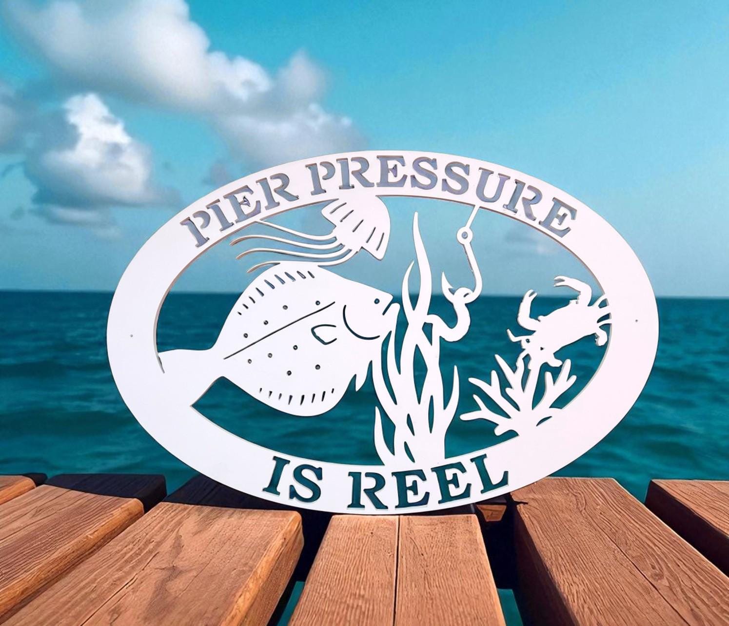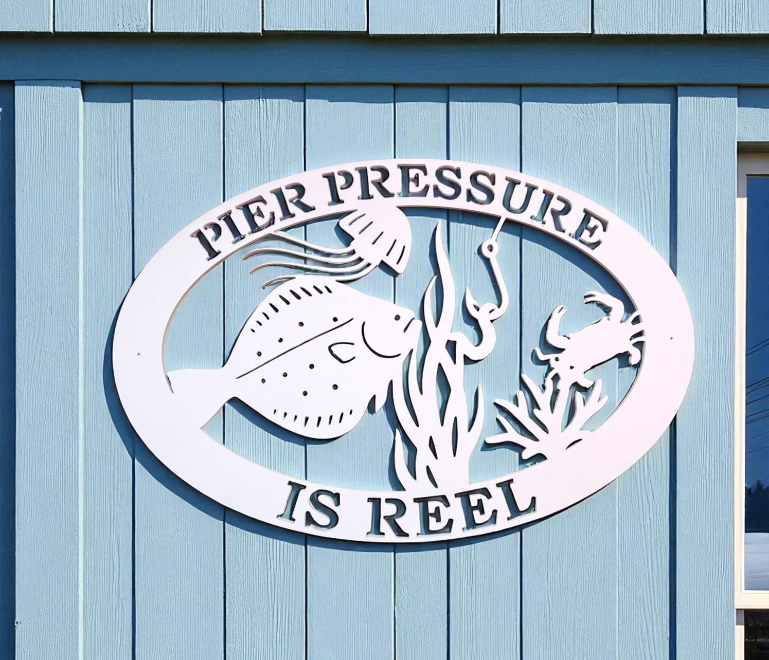 Add humor and coastal charm to your home, dock, or beach house with this "Pier Pressure is Reel" PVC Wall Sign. Featuring a fun design with fish, a crab, and seaweed, this nautical piece is perfect for anyone who loves fishing, boating, or simply spending time by the water.