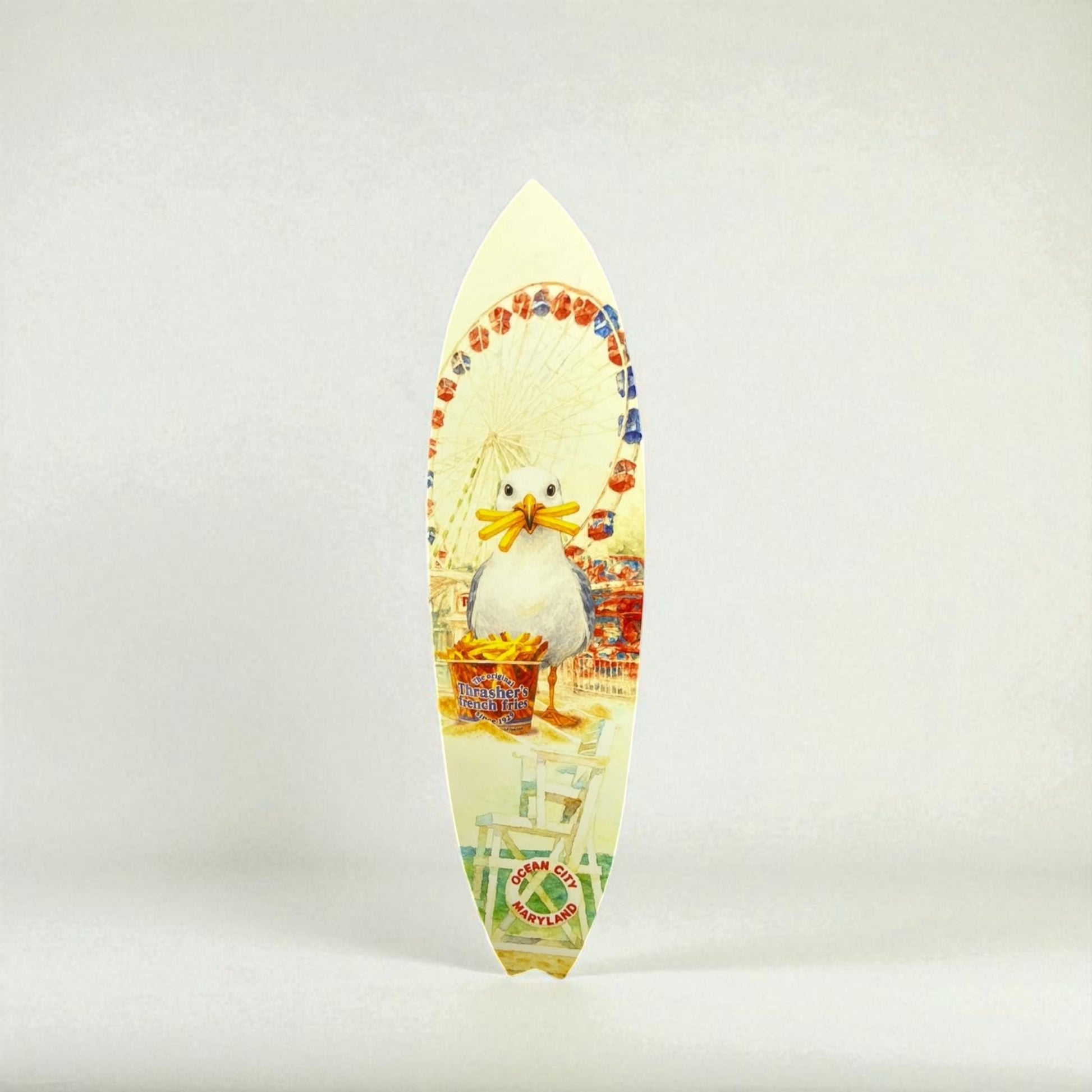 Bring the fun and nostalgia of the Ocean City boardwalk into your home with this Ocean City Maryland Surfboard Wall Art. Featuring a playful seagull stealing fries from a Thrashers French Fries bucket with the iconic Ferris wheel in the background, this design captures everything we love about the beach, boardwalk, and coastal life.