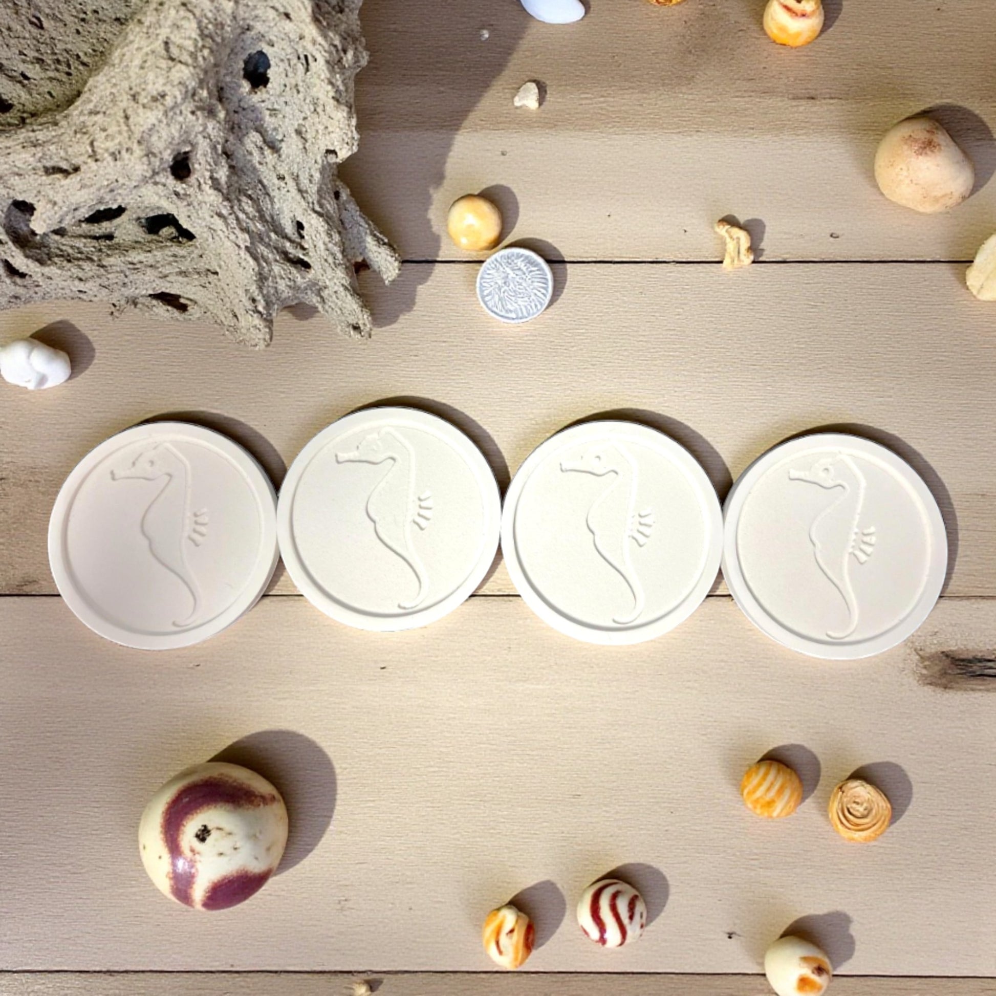Each features a raised, carved-style seahorse design